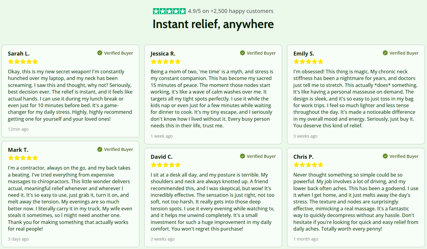 Offrez-vous un massage des tissus profonds professionnel à tout moment, où que vous soyez. Fatigué(e) des douleurs persistantes à la nuque et aux épaules après une longue journée ? Notre coussin de massage Shiatsu de pointe imite les gestes experts d'un(e) masseur(euse), soulageant efficacement vos muscles les plus tendus. Que vous soyez à la maison, au bureau ou en déplacement, la relaxation absolue est désormais à portée de main.