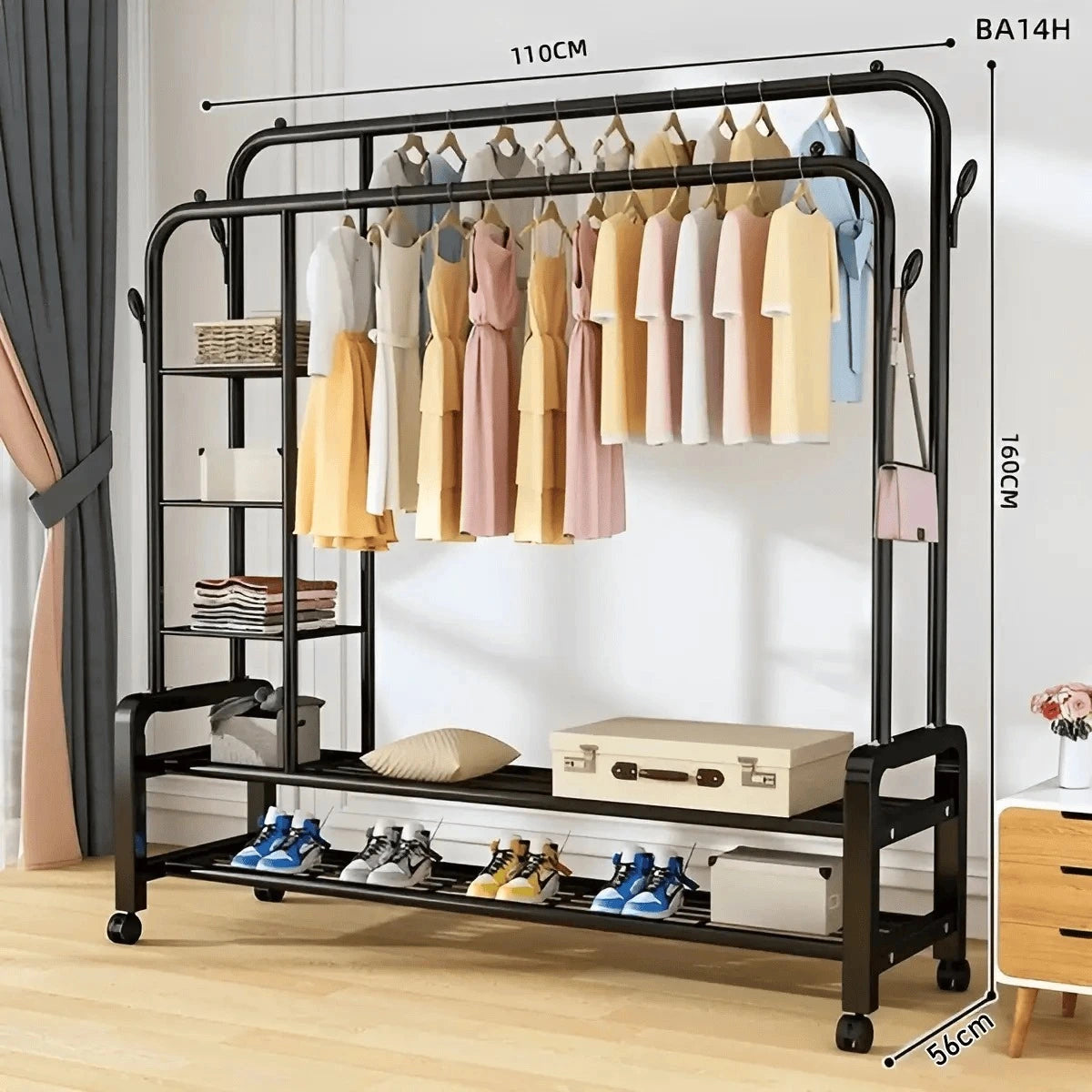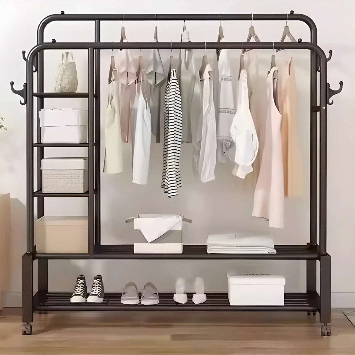 🚗 Équipé de roulettes pivotantes, vous pouvez le déplacer facilement d’une pièce à l’autre. Parfait pour une utilisation dans la chambre, la buanderie, le dressing ou même pour exposer des articles dans une boutique.