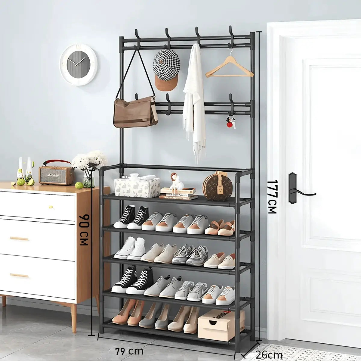 Ce porte-manteau multifonction est la solution idéale pour un espace d’entrée bien rangé. Avec ses 5 niveaux intelligemment répartis, vous pouvez accrocher manteaux, vestes, foulards, tout en rangeant chaussures et sacs à la base.